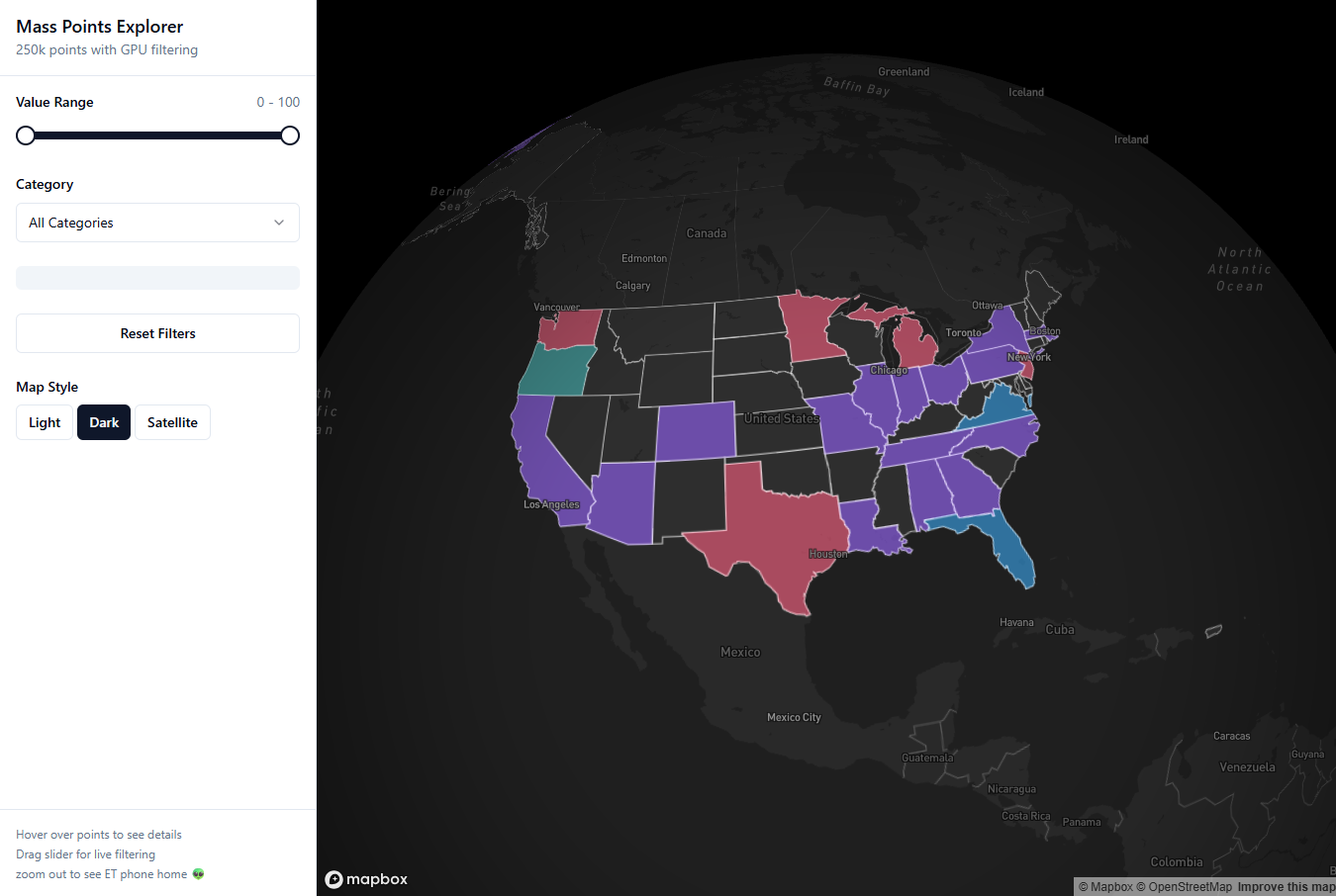 Mass Points Explorer is a performance-focused geographic dashboard capable of rendering and filtering 250,000 data points at 60 FPS. The core challenge was implementing a "live scrubbing" filter system that remains perfectly fluid without freezing the browser UI. To achieve this, I bypassed traditional CPU-heavy array operations and moved the filtering logic directly to the GPU via custom WebGL shaders.